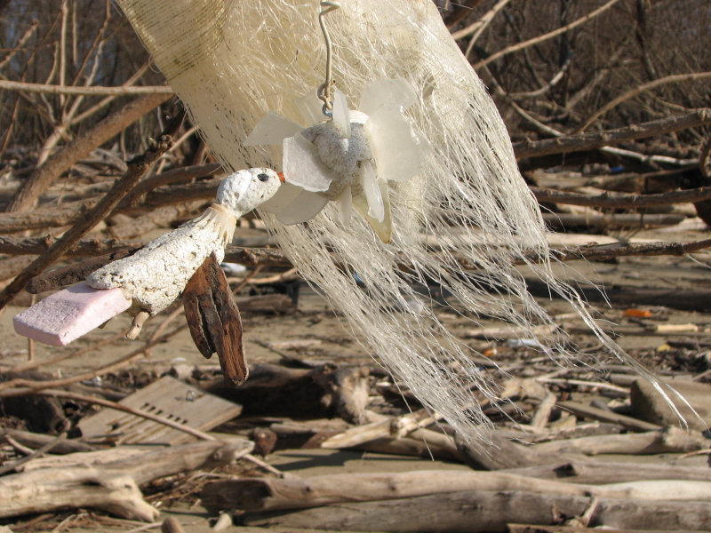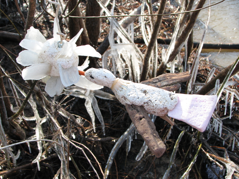 The Cumberland Greencrest was made from materials found entirely within the park and include: Styrofoam (body and wings), wood (its tiny feet), coal (the eyes), plastic ( the bill which was part of a fishing bobber and the tail which is a plastic lettuce leaf!, the yellow collar is from a soft drink bottle) and lastly the green crest is some foam-like material. It is held together in places with small, sharpened wood pegs.