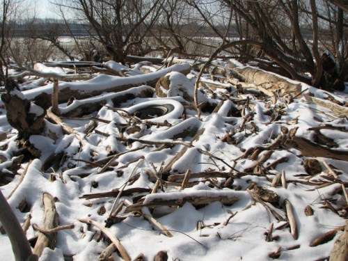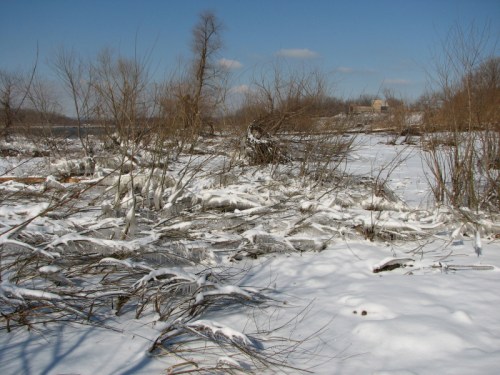 The Ice Tourist had to check out everything as closely as possible. He would climb upon the willow branches and roots to get the best view. As it turns out, he was a local guy who like me, likes to hang out near the river whenever he can. He was wearing a very thin and worn out t-shirt that said something about the town of Jeffersonville on it. That’s the next town over from the Falls of the Ohio State Park. I mentioned something about the poor condition of his garment and how it didn’t look substantial enough to keep him warm. His response was that feeling warm was as much a mental state of mind and he was far too engaged by this novel environment to feel the cold.