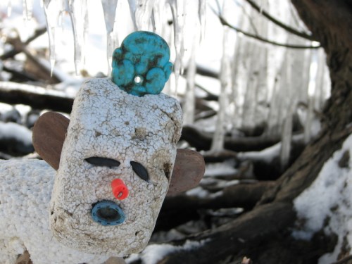 In an effort to foster personal wonder for the world, I made it out to the Falls of the Ohio on a day that wouldn’t risk frost bite. Over the years, I have prized coming out here on cold winter days especially if it meant seeing different ice formations. There are ice ribbons, sausage-shaped icicles, frozen homemade candles, and just plain ice blobs on display. I love the variety of forms and the play of light through the magic of solid water. The most interesting ice formations are near the water’s edge where the willow trees catch the rising steam off of the river. The water is warmer than the surrounding air temperatures and this “fog” helps coat the roots and branches with glassy layers of ice. I thought I had the place all to myself when I was joined in this frigid landscape by a new friend.