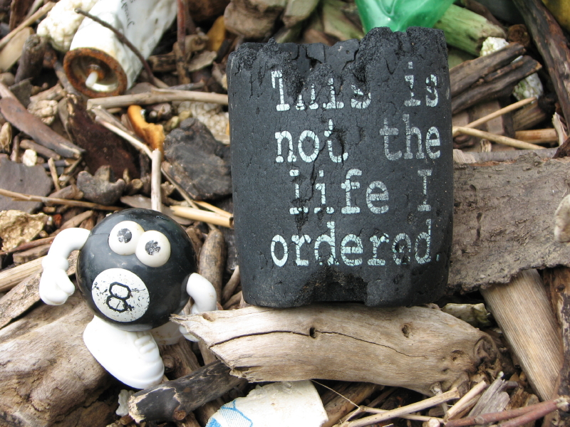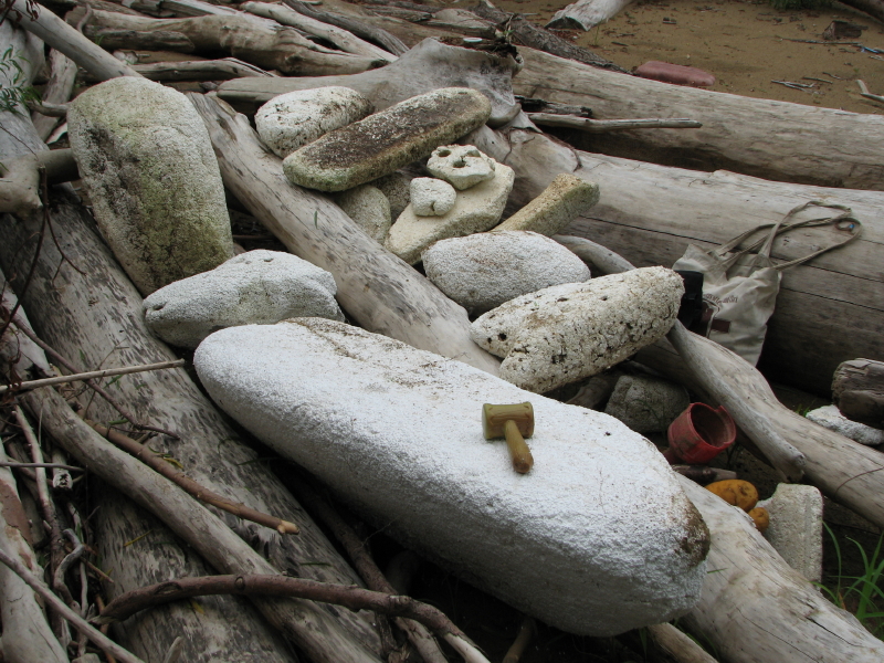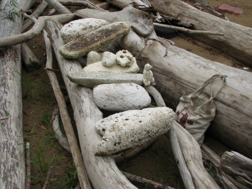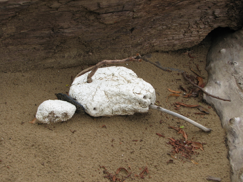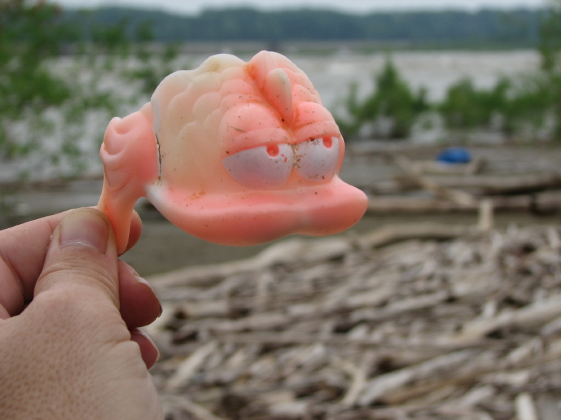 The walking stick comes in handy when you are not sure how deep the mud is in a certain area. You need to pick your path through by stepping on branches and broken planks. You can see brightly colored plastic just about everywhere you go. There are moderate to heavy waves along the river’s edge. Today I have a paper sack with me to collect the small river treasures carried by the water. This proves to be a mistake because the sack soon becomes water-logged and the bottom falls out.