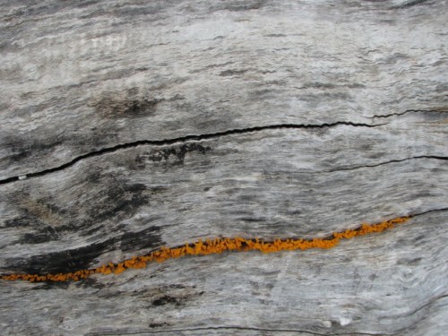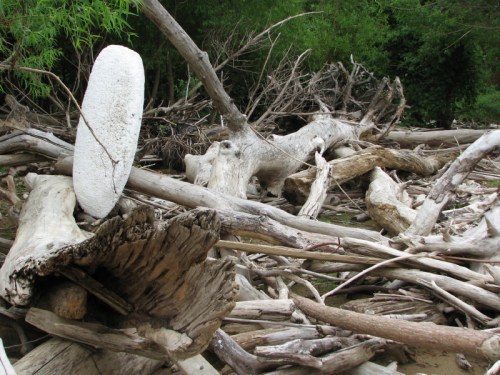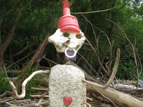 They have taken a recently washed up piece of Styrofoam and added some other found elements to improvise a toy raft. Jutting from the foam are many spent cigarette lighters ( you can always find these). There is also the red plastic flag from a mailbox…the kind you stand up to alert the postal carrier that you have outgoing mail. I can also see a larger piece of blue plastic, perhaps a sail? To me, it also resembles a shark fin. As much as I like this family’s creativity, I am however, dismayed by the graffiti on the side of the log. This is something I’m starting to see more of on the bridge and through out the park. It makes me wistful for the days when scrawling bad words and so and so loves so and so in the sand were sufficient means of expression.