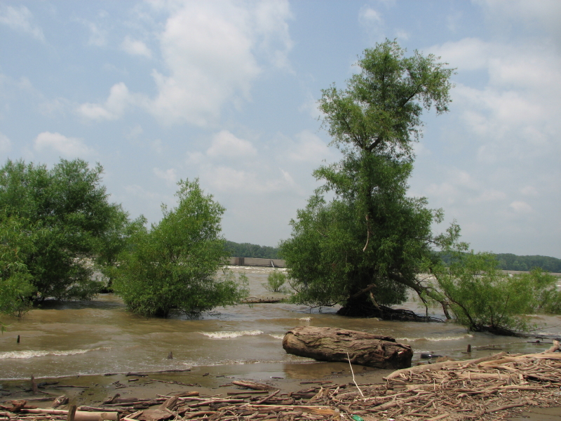 The river has given ground, but just a sliver of it. Although the waters have retreated, the Ohio River is still higher than usual. On the immediate riverbank is a new wooden obstacle course of washed away trees and huge logs. I find myself a walking stick and go exploring. I cover ground I have visited hundreds of times before and yet is made different with each episode of high water. I began this trip descending the frail cut lumber staircase whose bottom steps were recently covered by the river. I see a man and his children playing in the sand and pebbles and it looks like they are also building something. I wait for them to wander off to gather fresh materials before sneaking a closer peak.