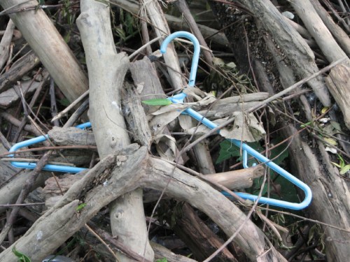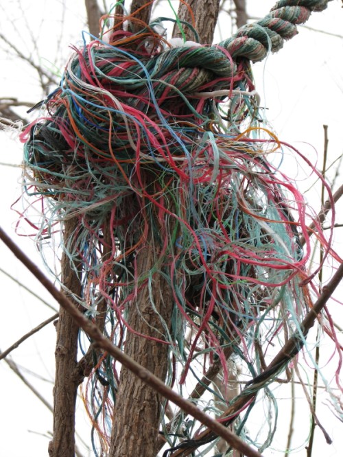 Here’s a barge cable that has been snared by a tree during high water. These large ropes I’m guessing are made from nylon and are very heavy. They are used to secure along the shoreline, long strings of barges along the intercoastal waterway. A lot of coal is moved on these barges and is burned to produce electricity. On occasion, I find a lot of washed up coal too. Water is powerful and does its best to reduce these ropes to something that is more manageable. Interestingly, I have come across several bird nests made almost entirely from these untangled cable fibers. In their own instinctual way, even the birds are trying to utilize these cables. Many of the resident willow trees are “decorated” with these snags.