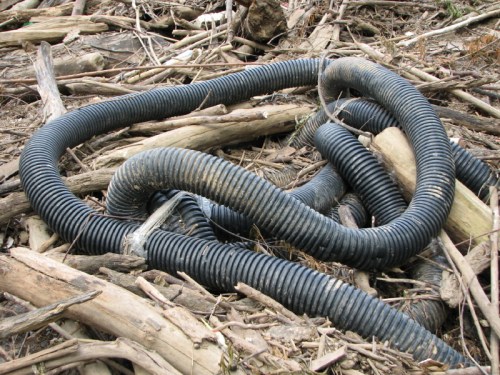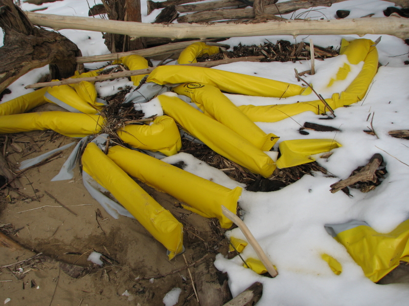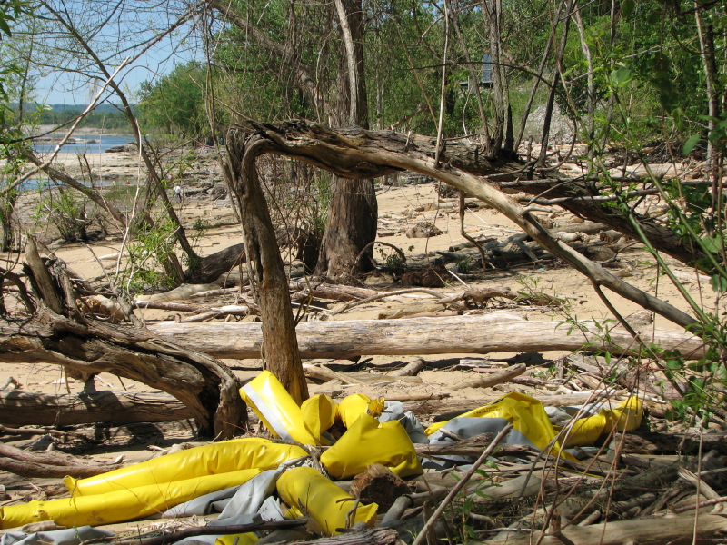This large black hose washed up here during the last flooding incident. It’s all tangled up into a much larger driftwood pile. Even something like this isn’t going to get reabsorbed into the natural system easily. It’s just tangled up and will lay there until the river moves it again or until one of the periodic river clean-ups where it might eventually get covered up in a landfill somewhere else. It probably won’t get recycled, so burying it is more a matter of out of sight, out of mind. This solution takes no inspiration from nature. Since late winter, I have been watching and photographing this boom that just showed up here in all its yellowness.