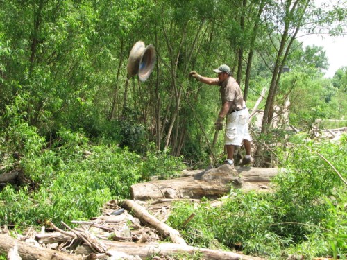 The last couple times I have come to the Falls, I have run into this man. We have talked a little bit, but there are some language barriers. Anyway, he’s delighted to have discovered a source of materials he can take to the salvage yard. I watched him nimbly moving from one log to another yanking out these old metal wheels. I have a lot of admiration for him and it made me think of how people from less developed countries have much that we can learn about living on this increasingly global scrap heap.