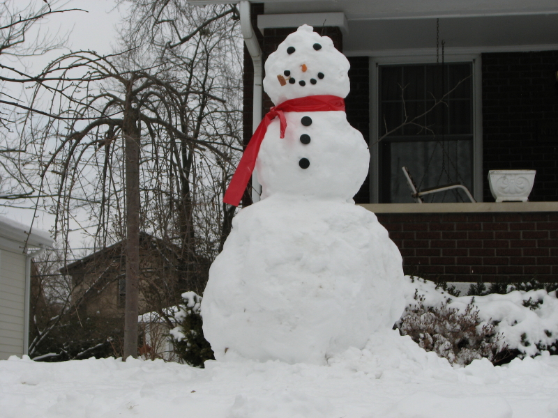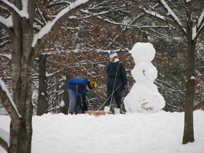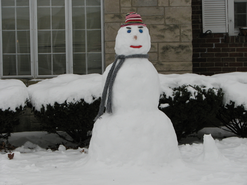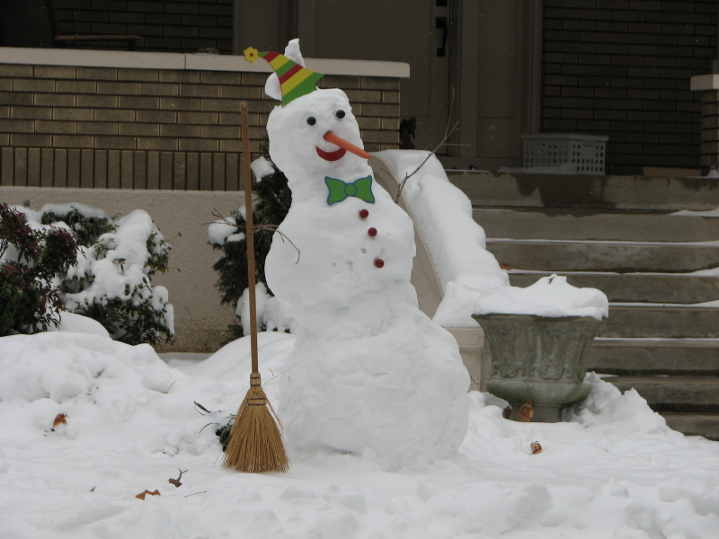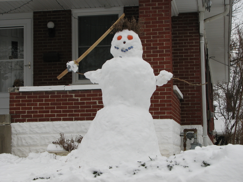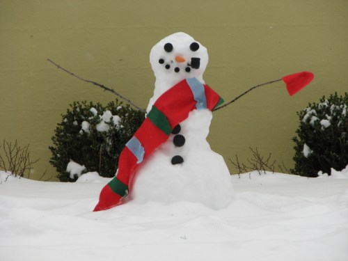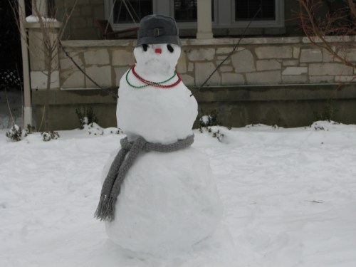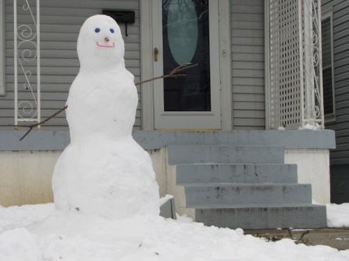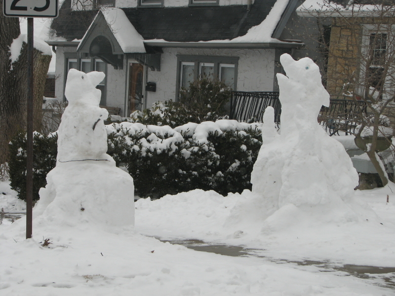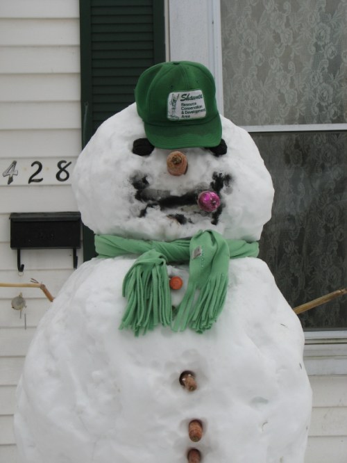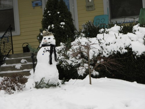 The basic idea for a snowman hasn’t changed much. Take three snowballs and stack them in graduated size from largest to smallest and use whatever is on hand to form features and accessorize. The use of a carrot for a nose has become a beloved standard. It’s been interesting to see how closely people have adhered to the snowman ideal and where variation or invention has occurred. Most of what I’ve seen over the last couple of days has been fairly traditional, but there were a few nice surprises to keep things lively. I came across a few snow creations that demonstrated both imagination, teamwork, and skill. Here are a few more single figures.
