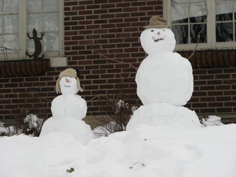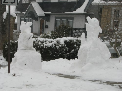 I imagine children and family at work on these beloved sculptures. It’s no accident that so many of these snowmen are close to the front door of the house. In this way, they are very site specific. They are meant to be seen and commented upon. Most of these snowmen, if they have arms, are rather feeble. For practical reasons, it is just too difficult to make an arm out of snow unless it is a part of the main body. I had to laugh at the one sporting what appears to be a wooden samurai sword! When you pair two or more snowmen together then you create another dynamic. Take a look.