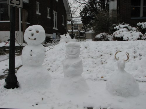 The six or so inches of snow that quieted Louisville over the past two days inspired a spontaneous celebration of a traditional form. The conditions were just right for an impromptu snowman festival! Nearly everywhere I travelled through the city I found these ephemeral sculptures gracing both public and private spaces. Before it became too late in the game, I grabbed my camera and recorded a few images which I’m presenting here. I went through Tyler Park, the Douglas Loop neighborhood, the Highlands, and the Shelby Park area and in a matter of a couple hours and found some interesting creations. I had so much success in a relatively short amount of time and distance, that the possibility of hundreds of snowmen existing scattered throughout the city gave me an extra reason to smile!