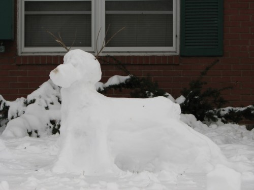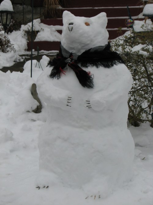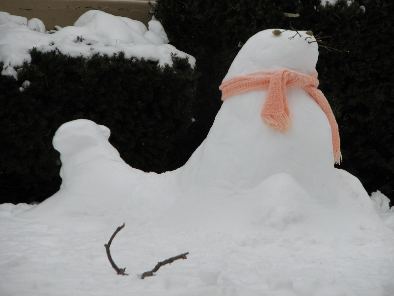 And now for a few more animal snow sculptures…how about this seal! It’s very effective and simple. The colorful scarf leads the eye right to the details that form the face. I like the way twigs are used to suggest whiskers.