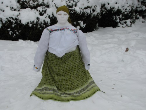 Perhaps the oddest piece I encountered was this modest sized figure. What set it apart aside from the more extensive use of clothing, is the mask covering the face. I did a double take on this one because the white mask didn’t fully register until I was right next to it.