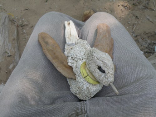 This time I abandoned my typical reserve and engaged the guy in conversation. I think I said something like,…”Hey mister, I can’t help noticing that you are collecting shoes and shoe soles and although I know it is none of my business…what are you going to do with the footwear?” I further added, ” I see you have tucked a few more soles into your belt since I saw you earlier.” The Sole Man (my mental designation for him) smiled easily from his green mouth and put me at ease. I had nothing to fear from him. We walked together for a while and he told me what his angle is and why he does what he does. Spotting another lost sole in the sand, my new friend bent over and lifted it up.